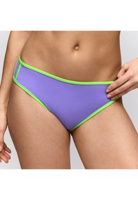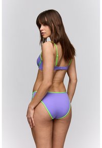 Conjunto de bikini morado con detalles verdes; cuenta con tela suave, copas estructuradas y tirantes ajustables. La parte de abajo tiene un diseño liso a juego.