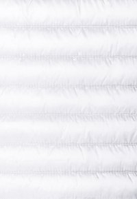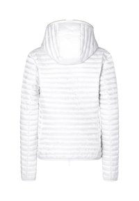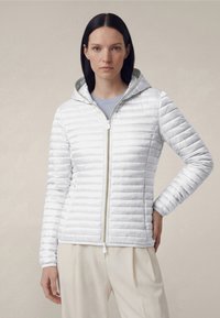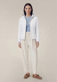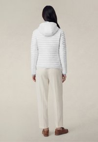 Mujer con cabello oscuro y liso que lleva una chaqueta blanca acolchada con cremallera y capucha, y pantalones beige, de pie con una mano en la cadera.