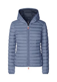 Chaqueta acolchada de color beige claro con diseño de acolchado horizontal, cierre con cremallera y acentos en naranja, y capucha incorporada. Textura suave y lisa.
