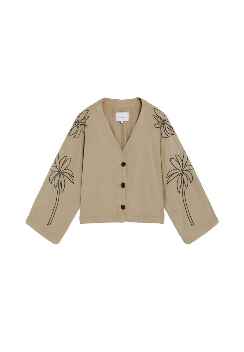 Chaqueta beige de manga larga con botones, mangas anchas y un diseño lineal negro de palmeras en ambos brazos y hombros.