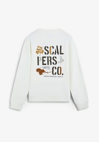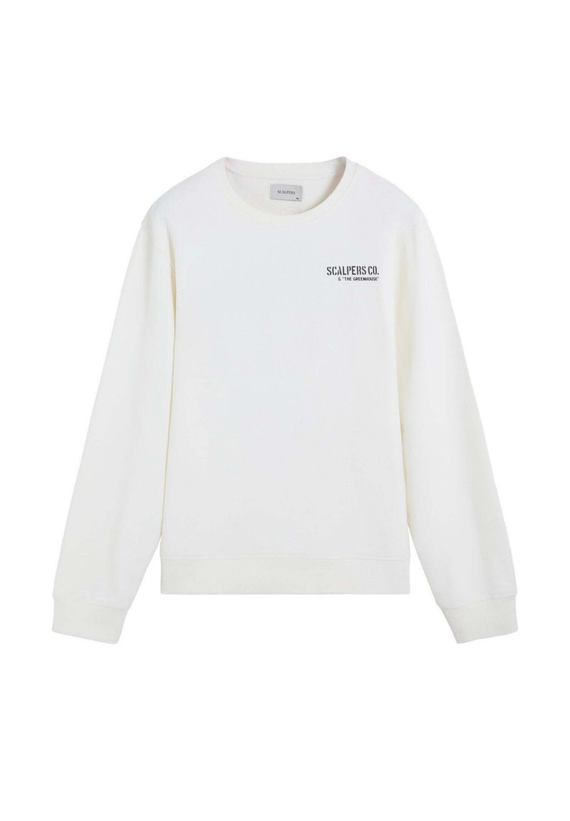 Sudadera blanca de manga larga con cuello redondo y un pequeño texto negro "Scalpers Co. & The Greenhouse" en el área del pecho izquierdo.