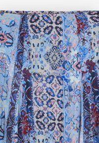 Falda azul plisada con patrones florales multicolor y geométricos en paneles verticales, hasta la rodilla, tela ligera.