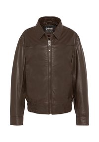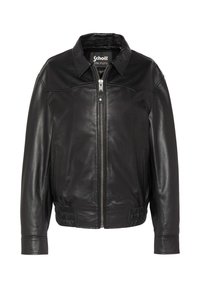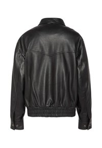 Chaqueta de cuero negro con cremallera frontal, cuello, dos bolsillos laterales y detalles de cintura elástica.
