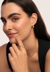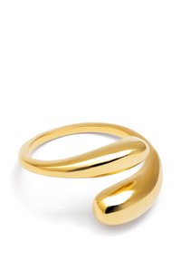 Anillo de oro con un diseño fluidamente alargado y acentos suaves y redondeados. Se lleva puesto en un dedo, destacando el brillo y la textura.