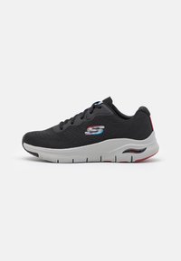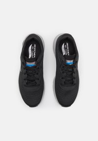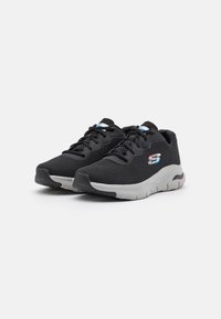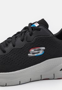 Zapatilla deportiva negra con parte superior de malla transpirable, suela gris, acento de logo colorido y detalles texturizados. Cuenta con una media suela acolchada.