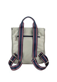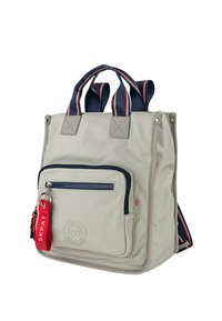 Bolsa tote gris con asas a rayas en azul marino y rojo, que cuenta con un bolsillo delantero con cremallera y detalle de logo, fabricada con un material liso y duradero.