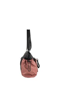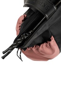Bolso tote negro y rosa con diseño de doble tela, que incluye un bolsillo frontal con cremallera y laterales ajustables con cordón. Asas negras.