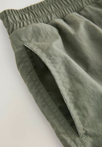 Pantalones cortos caqui con cintura elástica, que incluyen bolsillos laterales y un logo impreso en blanco, confeccionados con una tela ligera y texturizada.