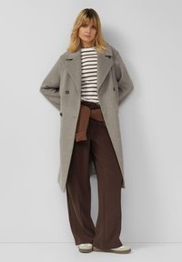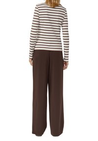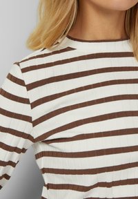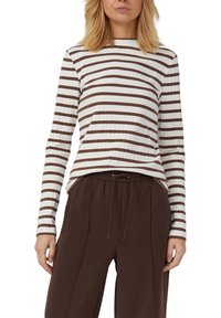 Top de manga larga acanalado con rayas horizontales marrones y blancas. Diseño de cuello redondo con una forma ajustada, combinado con pantalones oscuros.