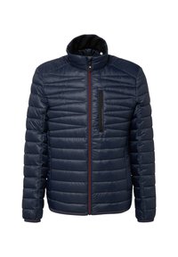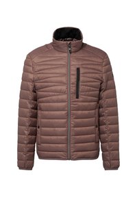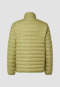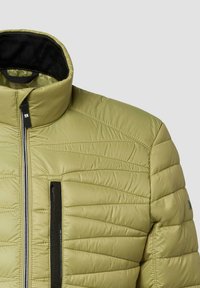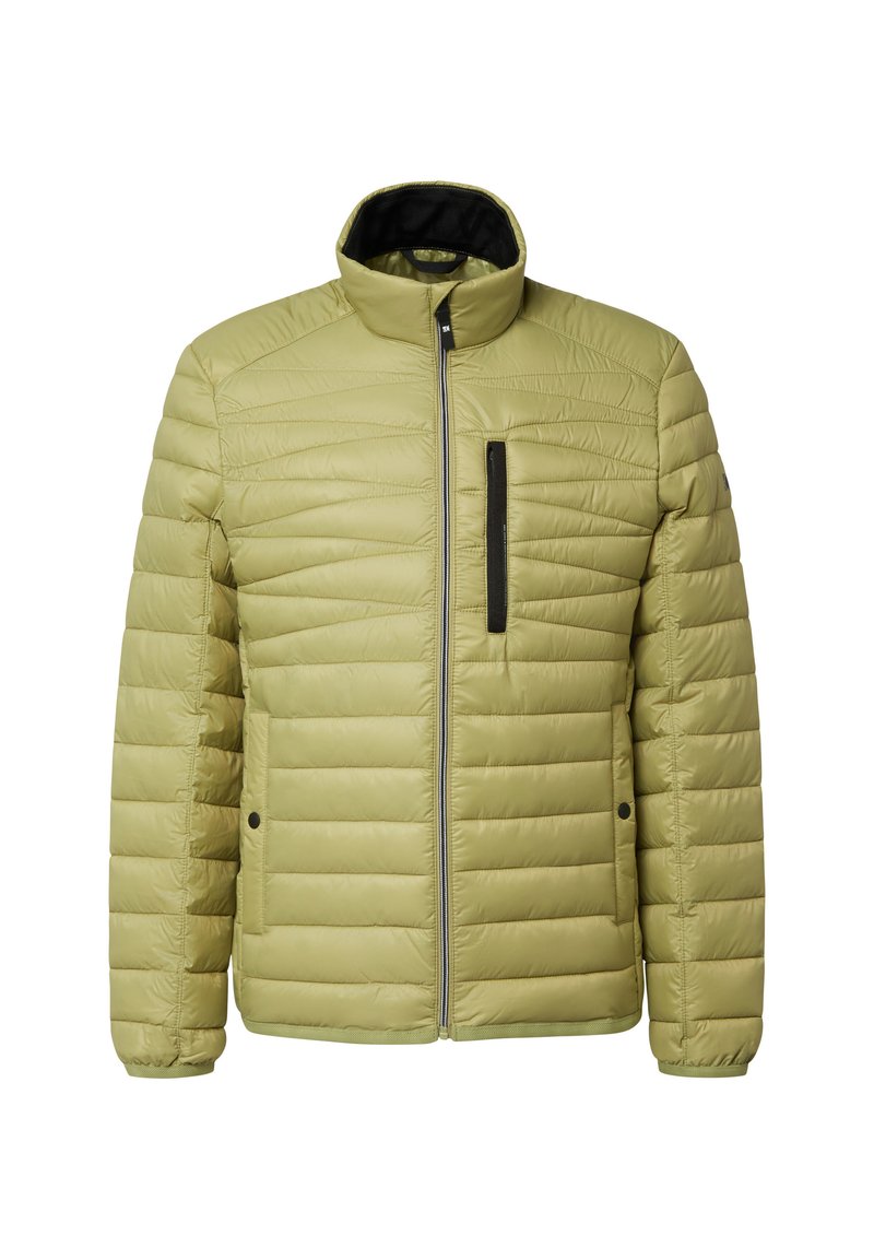 Chaqueta aislante verde oliva claro con cierre de cremallera, costuras horizontales, un bolsillo en el pecho y puños elásticos. Material liso y resistente al agua.