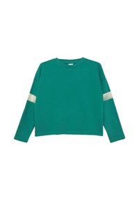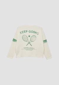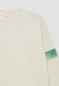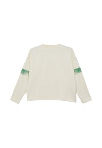 Sudadera crema de manga larga con cuello redondo y una sola franja verde desvanecida alrededor de cada parte superior de la manga.