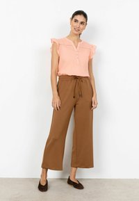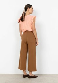 Mujer con pantalones marrones de pierna ancha y corte por encima del tobillo con cintura ajustable, top sin mangas color melocotón y zapatos planos marrón oscuro, de pie contra una pared blanca.