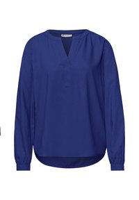 Blusa de manga larga de color lavanda claro con escote en V, puños plisados y corte holgado, combinada con jeans de mezclilla azules. Textura suave.