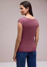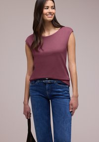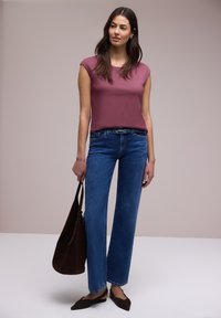 Mujer sonriente, vestida con una camiseta sin mangas color malva y jeans azules, sosteniendo un bolso oscuro sobre un fondo beige liso.