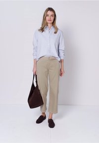Mujer con pantalones beige de pierna recta, camisa azul claro abotonada con las mangas remangadas y mocasines marrón oscuro, de pie contra una pared lisa.