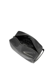 Neceser de cuero negro de forma rectangular, con cierre superior de cremallera y un bolsillo frontal. Presenta un logo grabado en el lateral.