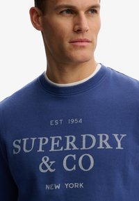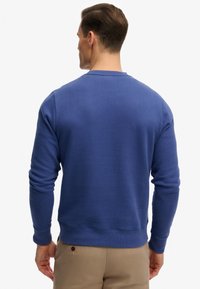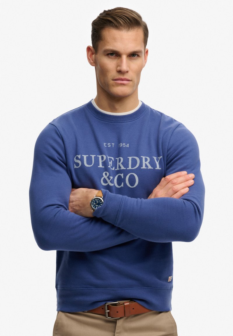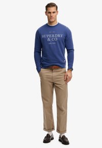 Hombre con los brazos cruzados, viste sudadera azul de Superdry, cinturón marrón, pantalones beige y reloj de pulsera, sobre fondo blanco.