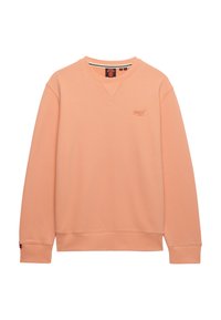 Sudadera negra con puños acanalados y cuello redondo, con un pequeño logo en el pecho. Combinada con pantalones caqui claros y un reloj.