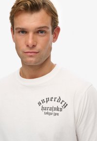 Camiseta de algodón blanca con estampado gráfico negro en el pecho, mangas cortas y cuello redondo. Combinada con pantalones caqui y un cinturón negro.