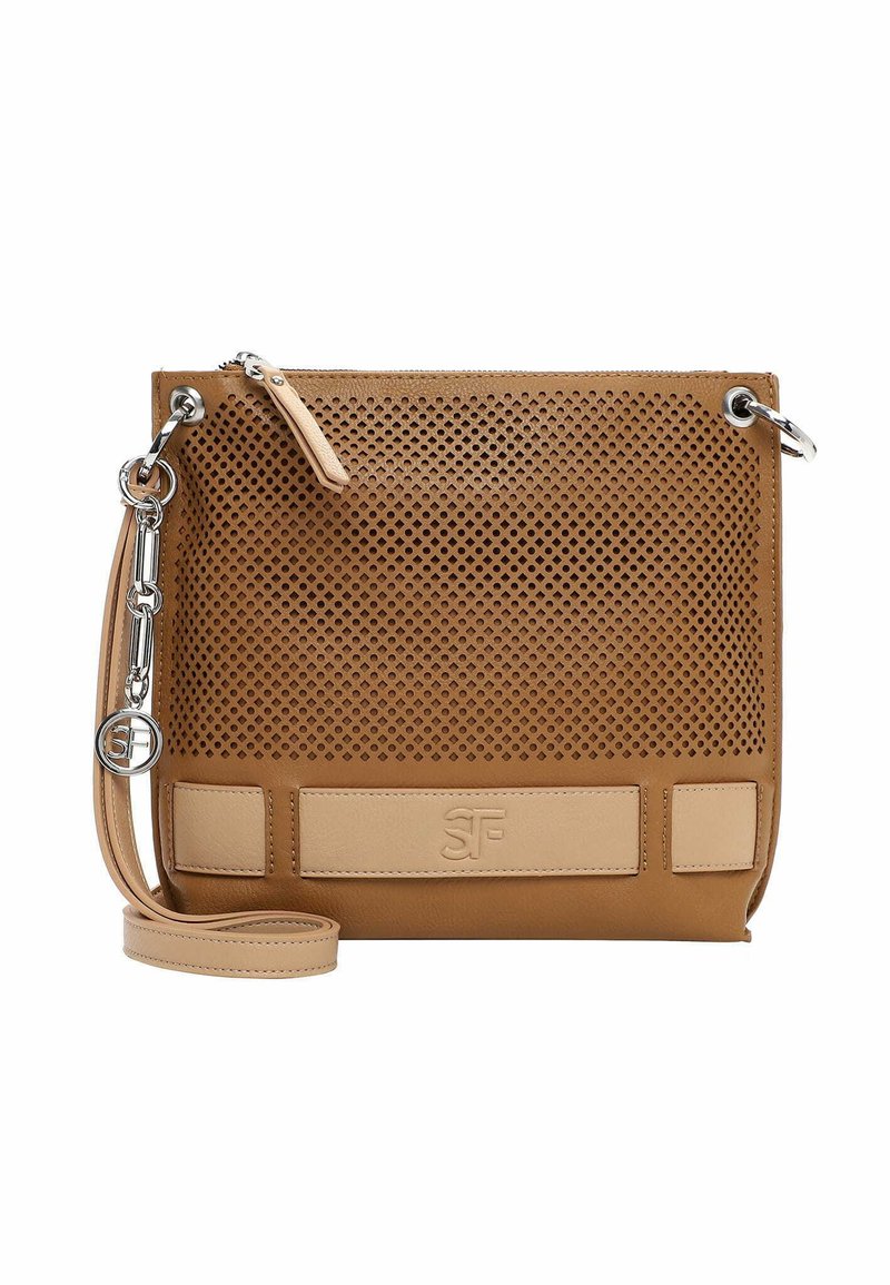 Bolso bandolera de cuero color canela con panel frontal perforado, herrajes plateados, correa ajustable y logo SF en relieve sobre parche beige.