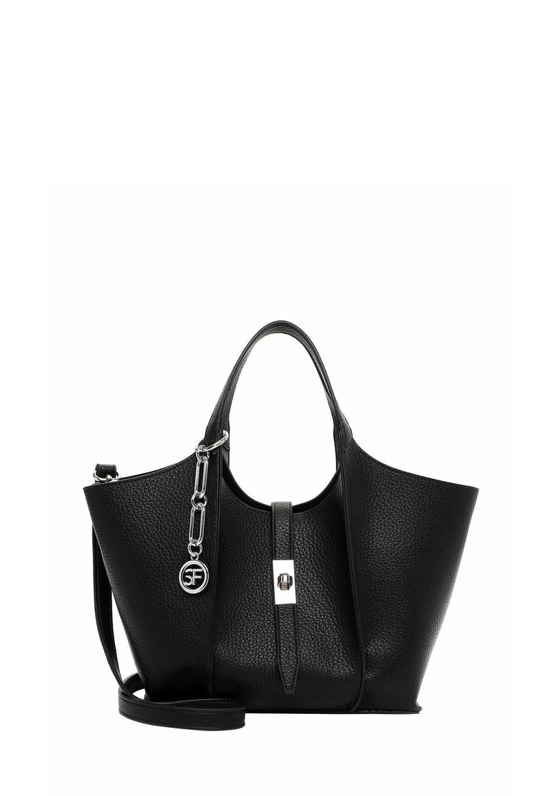 Bolso de mano de cuero negro texturizado con dos asas, una correa de hombro desmontable, una correa frontal con un cierre plateado y un colgante con el logo SF en plata.