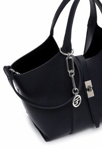 Bolso de cuero negro texturizado con asas superiores, una correa de hombro desmontable, una correa frontal con hebilla plateada y un colgante redondo con el logo en plata.