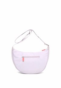 Bolso de hombro en forma de media luna de color lila claro, con una correa ajustable y un pequeño tirador de cremallera rosa y un detalle de logotipo.
