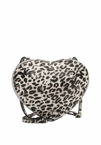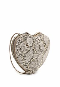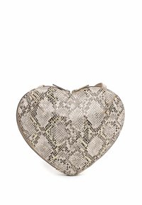 Bolso bandolera con forma de corazón, patrón de piel de serpiente en tonos beige y marrón, y correa ajustable para el hombro.