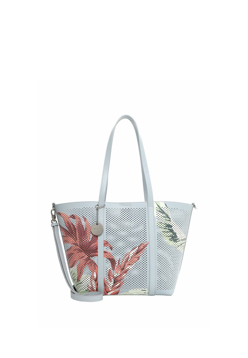 Bolso tote azul claro perforado con patrones de hojas tropicales en rojo y verde, dos asas largas y una correa de hombro desmontable.