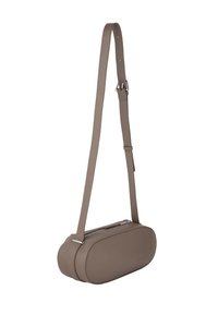 Mano sosteniendo un bolso cruzado de cuero marrón con una correa y hebilla metálica, que presenta un pequeño nombre de marca en relieve en el frente.