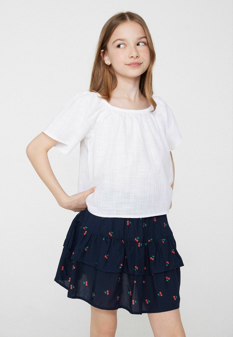 Chica con cabello castaño claro que lleva una blusa blanca y una falda azul marino con estampado de cerezas rojas, de pie con las manos en las caderas mirando de lado.
