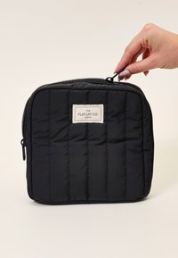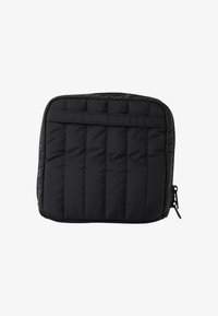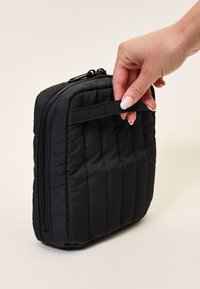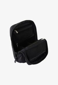 Mide 18 x 7 x 20 cm y cuenta con dos separadores móviles en el compartimento principal y dos bolsillos de malla con cremallera para artículos más pequeños.