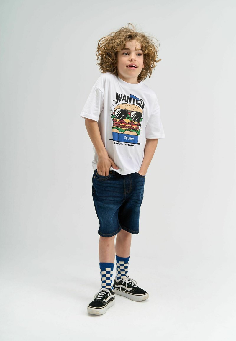 Camiseta blanca con un gráfico de una hamburguesa, pantalones cortos de mezclilla azul, zapatillas en blanco y negro, y calcetines de cuadros azules. Cabello rizado natural.