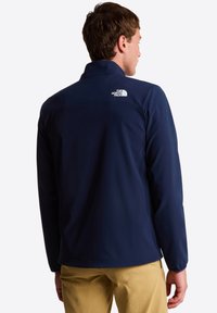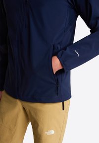Chaqueta softshell azul marino con cuello alto, bolsillos con cremallera y detalles del logo en blanco. Textura suave con un diseño entallado.