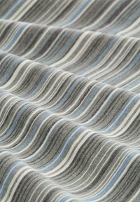 Hombre vistiendo una camiseta de manga corta con cuello redondo y rayas horizontales en gris, azul y blanco, combinada con jeans azules.