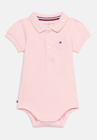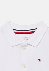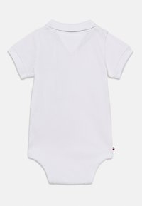 Body corto de bebé de manga corta blanco con cuello, botones delanteros y pequeño logotipo de Tommy Hilfiger en el pecho y la costura lateral.