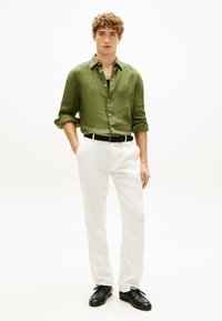 Joven con una camisa de lino verde oliva abotonada con las mangas remangadas, pantalones blancos y cinturón negro, de pie con las manos en los bolsillos.