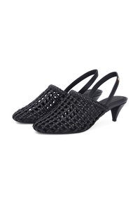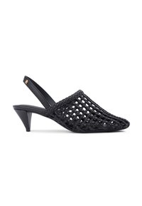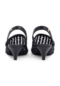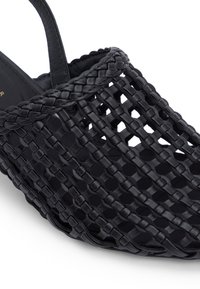 Mule negro con tira trasera, diseño de celosía abierta tejida y tacón bajo cónico, con un pequeño emblema dorado en la correa.