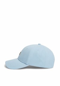 Mujer con gorra azul claro con logo dorado, pendientes de aro dorados, blazer azul marino cruzado con botones dorados y camisa a rayas debajo.