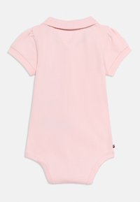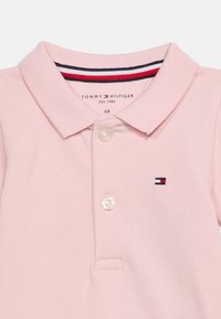 Niño pequeño sentado con las piernas cruzadas, vistiendo un mono de manga corta color rosa claro con cuello, botones y un pequeño logotipo en el pecho.