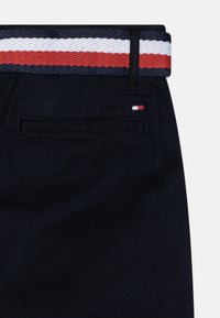 Pantalones cortos negros con bolsillos laterales y un cinturón tejido con rayas rojas, blancas y azules. El material es algodón con una textura suave.