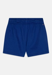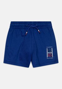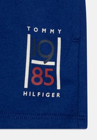 Pantalones cortos de algodón azules con una cintura elástica y cordón. Presentan texto gráfico en blanco y rojo: "TOMMY 1985 HILFIGER" en una pierna.