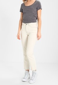 Top gris de manga corta en mezcla de algodón con cuello redondo, combinado con pantalones vaqueros blancos de cintura alta con cierre de botones y bolsillos.
