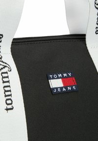 Joven con chaqueta vaquera, top corto blanco y pantalones claros sostiene un bolso negro Tommy Jeans con tirantes blancos sobre el hombro.