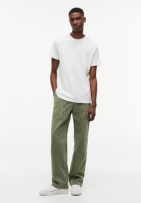 Hombre con camiseta blanca de Tommy Jeans y pantalones verdes, de pie con las manos detrás de la espalda contra un fondo blanco liso.