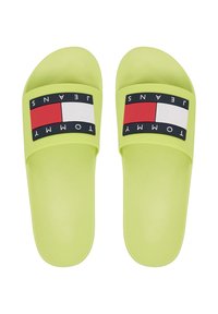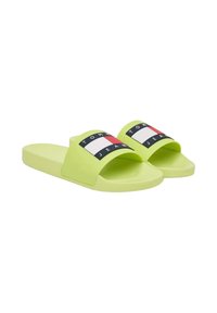 Sandalia lime green tipo slip-on con una correa ancha que presenta un bloque de logo de Tommy Jeans en rojo, blanco y negro en la parte superior.