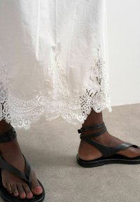 Falda larga blanca con borde de encaje en el dobladillo, llevada con sandalias planas negras de tiras y una camiseta negra, de pie sobre un suelo gris frente a una pared blanca.