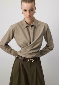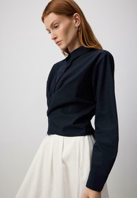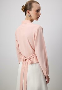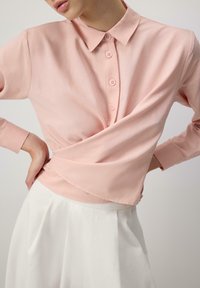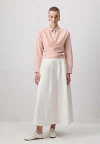 Mujer vistiendo una blusa cruzada de manga larga color rosa claro con cuello y falda plisada blanca de talle alto, mirando hacia su izquierda.