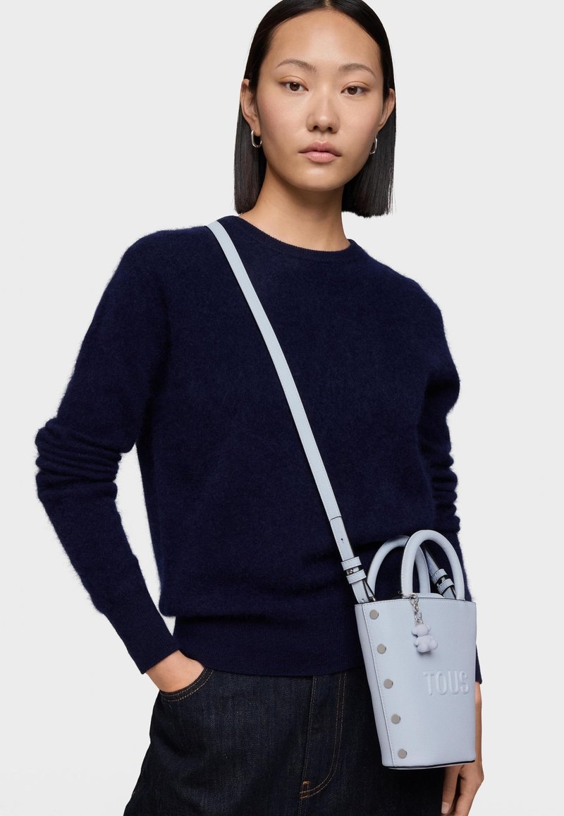 Mujer con cabello liso y negro, vestida con un suéter azul marino y jeans oscuros, llevando un bolso Tous azul claro con correa para el hombro.