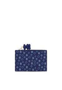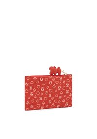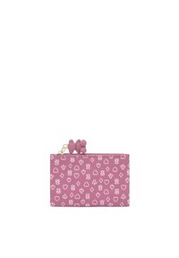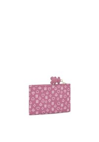 Una mano sostiene una pequeña bolsa con cremallera rosa con patrones de corazones, diamantes y tréboles blancos, y un tirador de cremallera en forma de oso.